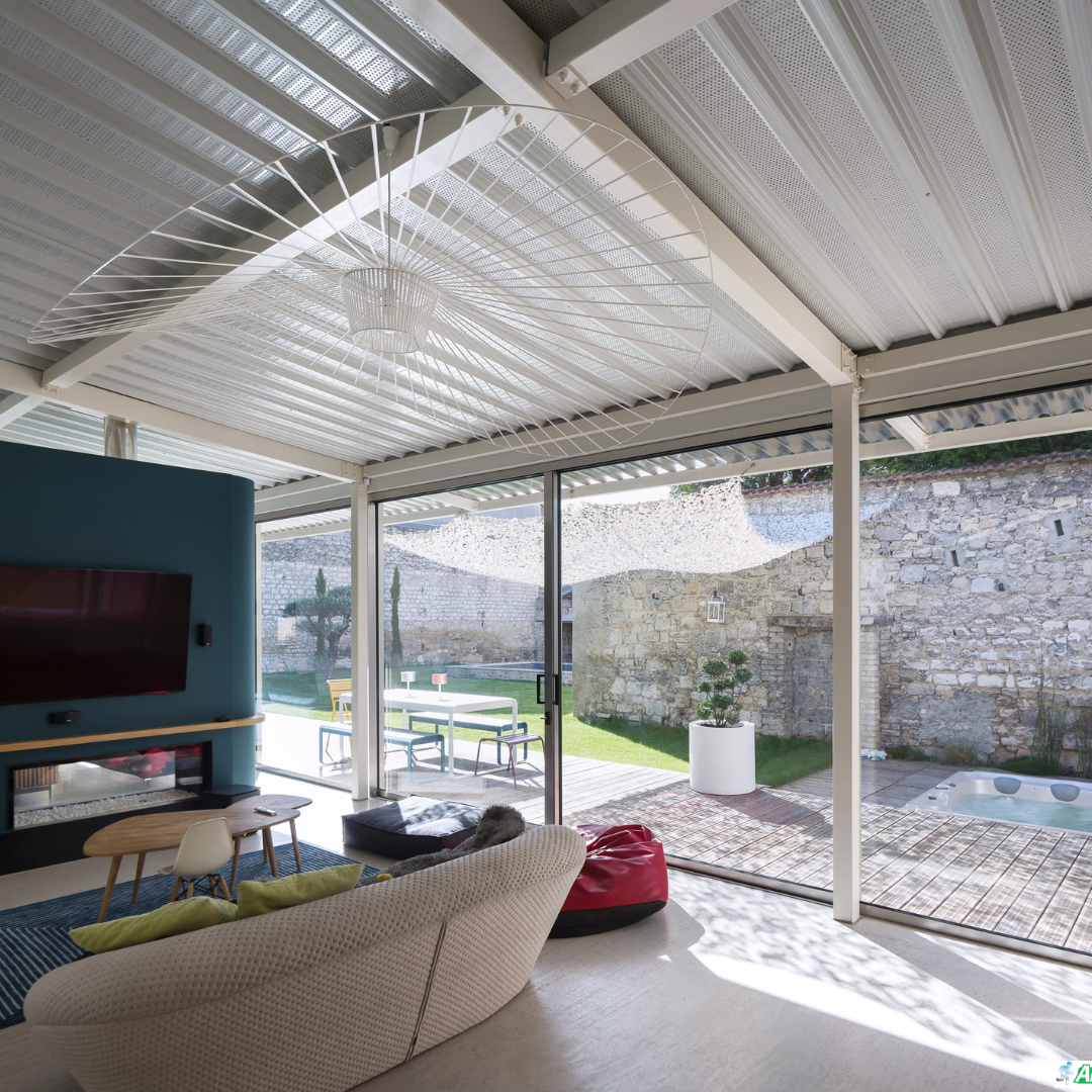 D’une longueur développée de 17 m (8 vantaux) et de hauteur maxi 2,60 m, ce mur de verre transparent inonde l’intérieur de lumière naturelle.