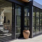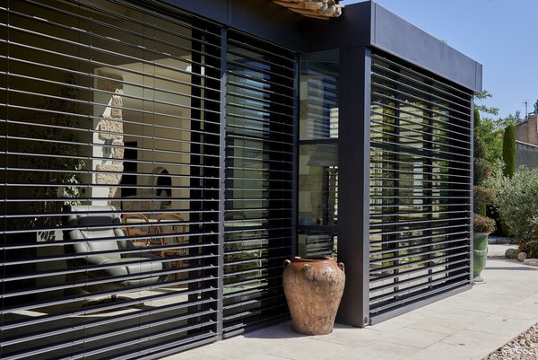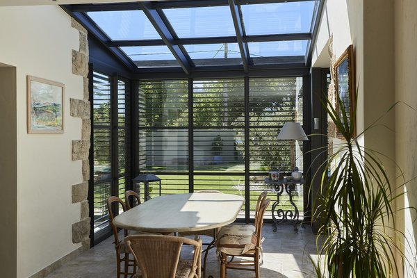 Totalement personnalisable, la double extension Technal se pare aussi d’éclairages LED. Ils sont intégrés discrètement au niveau des traverses horizontales pour un effet presque invisible. A la nuit tombée, ils animent la façade et créent des jeux de lumière qui se reflètent dans la piscine. La journée, un volet roulant régule également la lumière et l’occultation totale du toit de verre. Les larges possibilités d’ouvertures des baies coulissantes permettent de laisser l’air frais circuler librement. Et l’hiver, les apports solaires réchauffent la pièce, réduisant les besoins en chauffage.