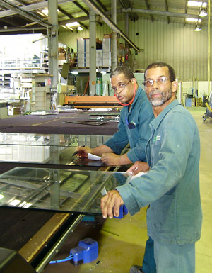 La manipulation du verre – du fait de sa fragilité – est délicate. Celui-ci, à cette époque, est livré dans les caisses en bois acheminées par camion comprenant 2 caisses sur chevalet par voyage. Le stock est rangé dans le dépôt, feuille par feuille, à bras d’homme munis de ventouses.