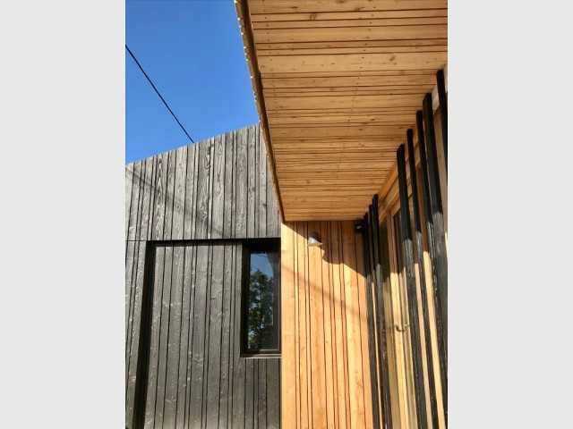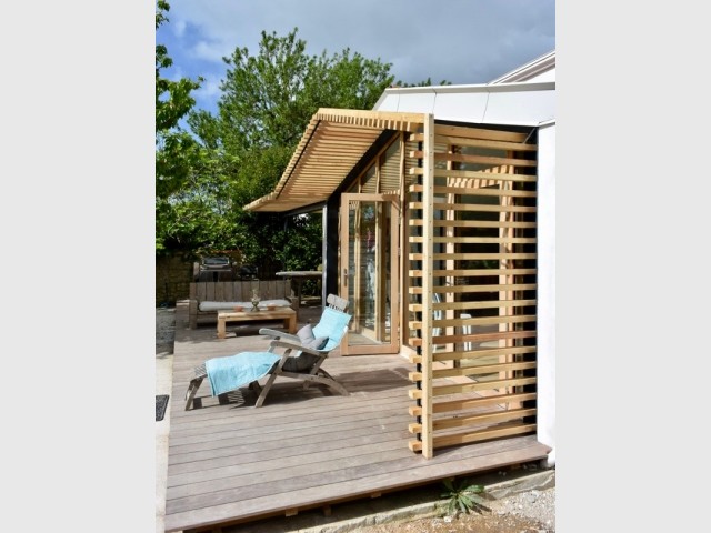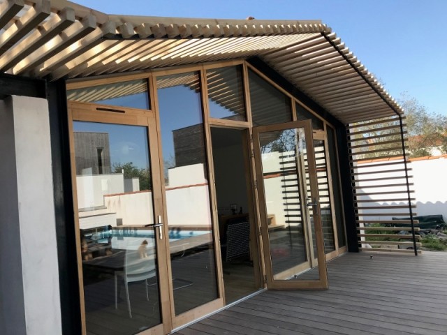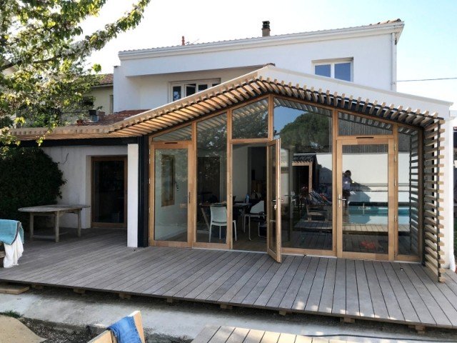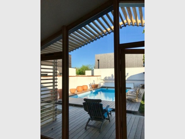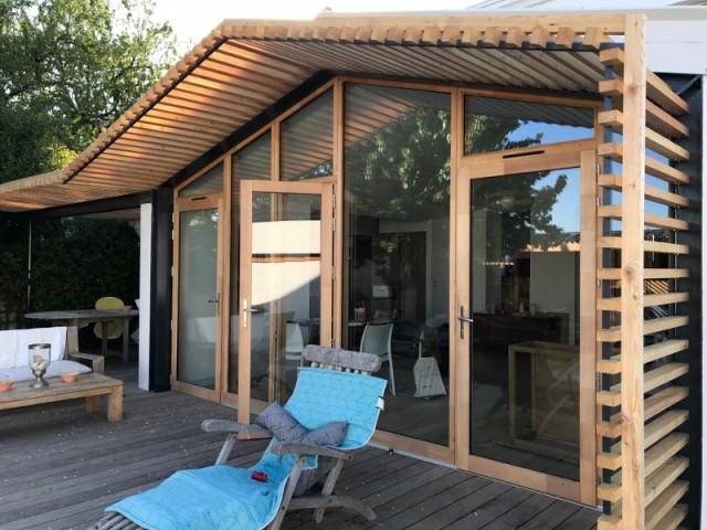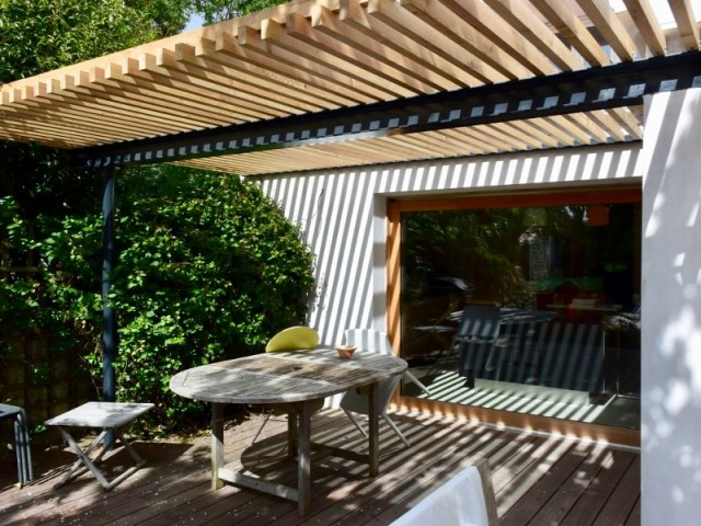 Grâce à une baie vitrée sur-mesure en lieu et place de la façade, cette maison s’est largement ouverte sur son jardin. Un effet “dedans/dehors” bluffant, avec une pergola en bois et métal très naturelle.